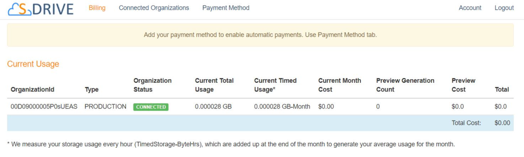 You can start by installing the S-Drive app and connecting your Salesforce org, for which you can back up data. Also, you’ll be able to track usage metrics and billing details so you can always have an idea about the cost.