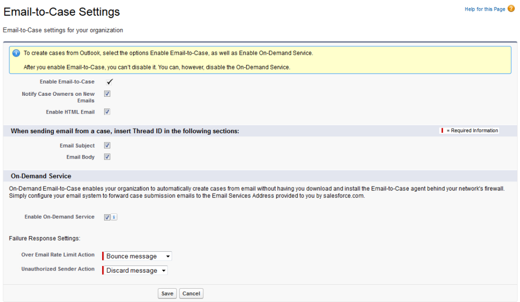 Enable the functionality by clicking Enable Email-to-Case. Once enabled, Email-to-Case can’t be disabled but on-demand Email-To-Case can be.