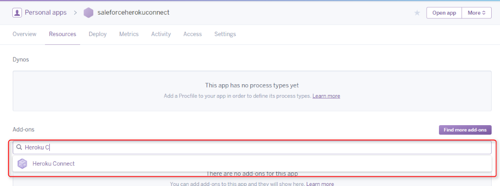 In the Add-ons search box, look for Heroku Connect. Then select provision to add Heroku Connect to your application.