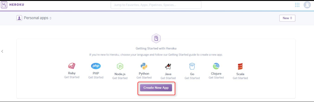 Navigate to the Heroku app creation page to find and click Create New App. You have to set a suitable name and region for your application. Then click Create App.