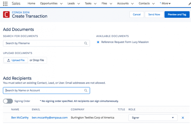 Another interesting thing about the app is that it seamlessly integrates with other Conga products like CLM, Composer, and CPQ. You can access one-click integration by Composer to send eSignature requests right when you create documents.