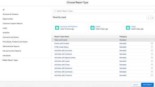 You can now access the enhanced report type selector to find the right report. Click ‘New Report’, you’ll see your recently used report types, along with the list of report types with name and category.