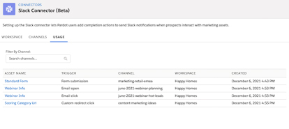 This beta feature brings along many improvements. You can now access completion action for sending a Slack notification when your prospects interact with marketing assets. Also, you can see a Usage tab on the Slack connector to track which of your assets are using the completion action.