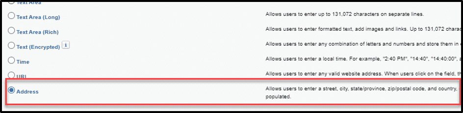 Note: Before the custom address field is available, you must have State and Country/Territory picklist values configured.