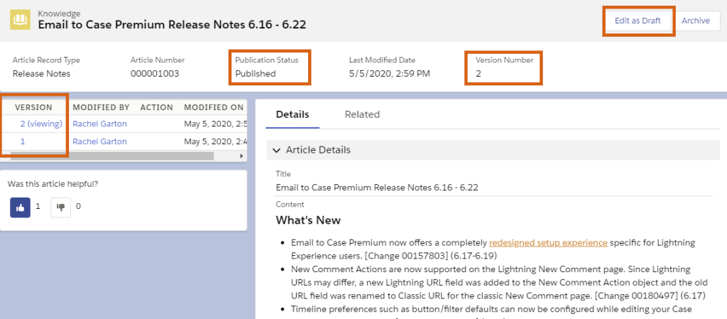 Each article in the knowledge base has been assigned a respective Version number. Whenever a user has to make changes to an article, they will have to edit it to a new version and publish it. This enables users to publish content without impacting the existing versions.